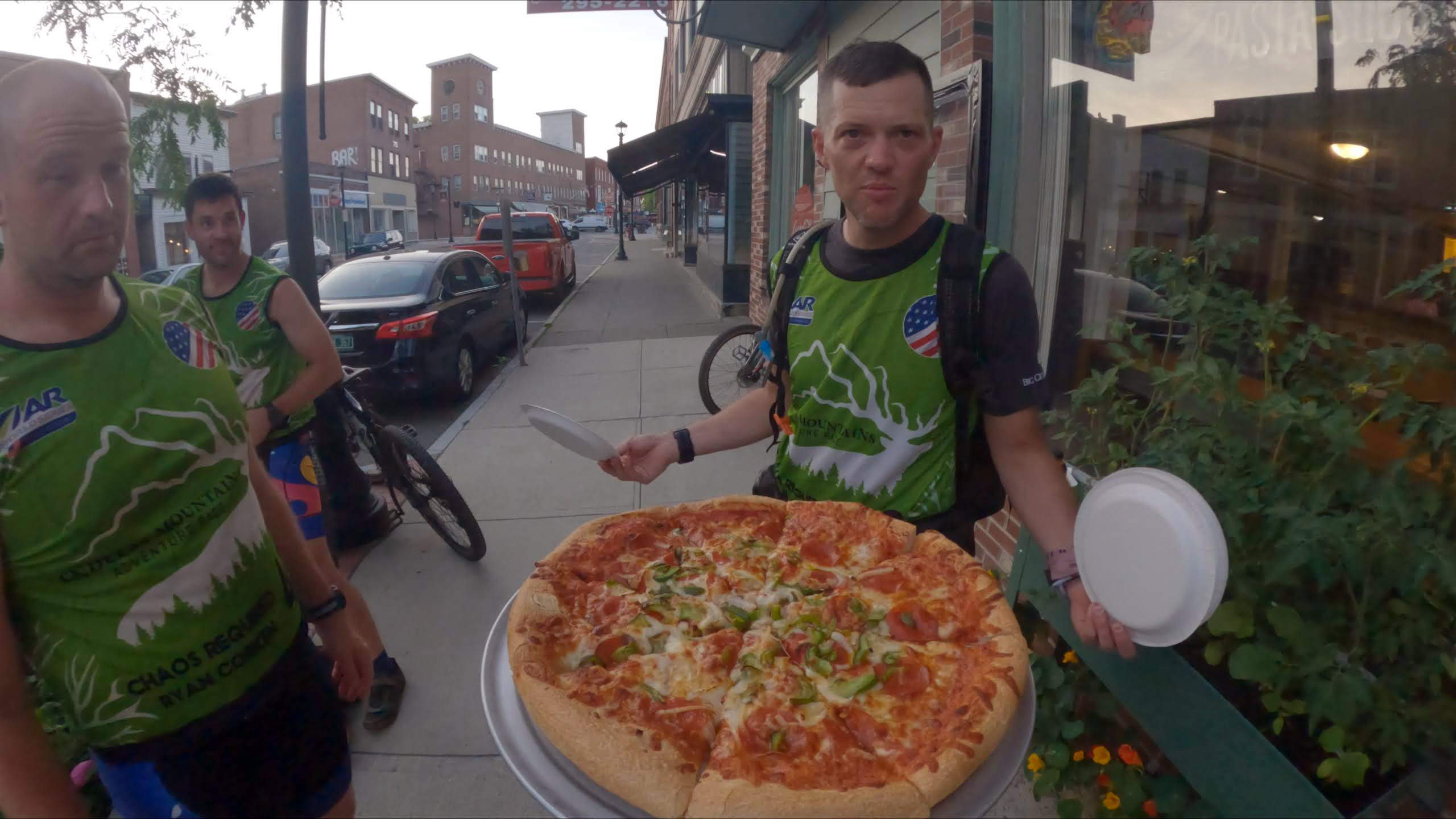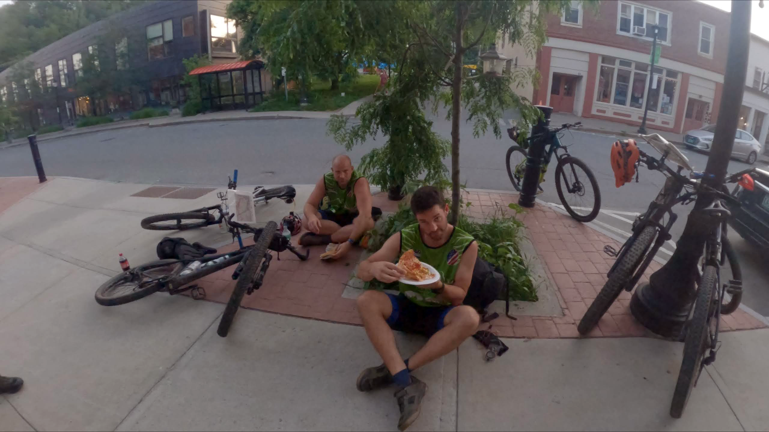 Ryan had been asking for real food since the previous night, so when we rolled into White River Junction just before 8 PM, we made it happen. The pizza shop was clearly closing, but when we explained what we were doing, they stayed open for us. Incredible pizza and garlic bread that would fuel us through our third night of racing.
