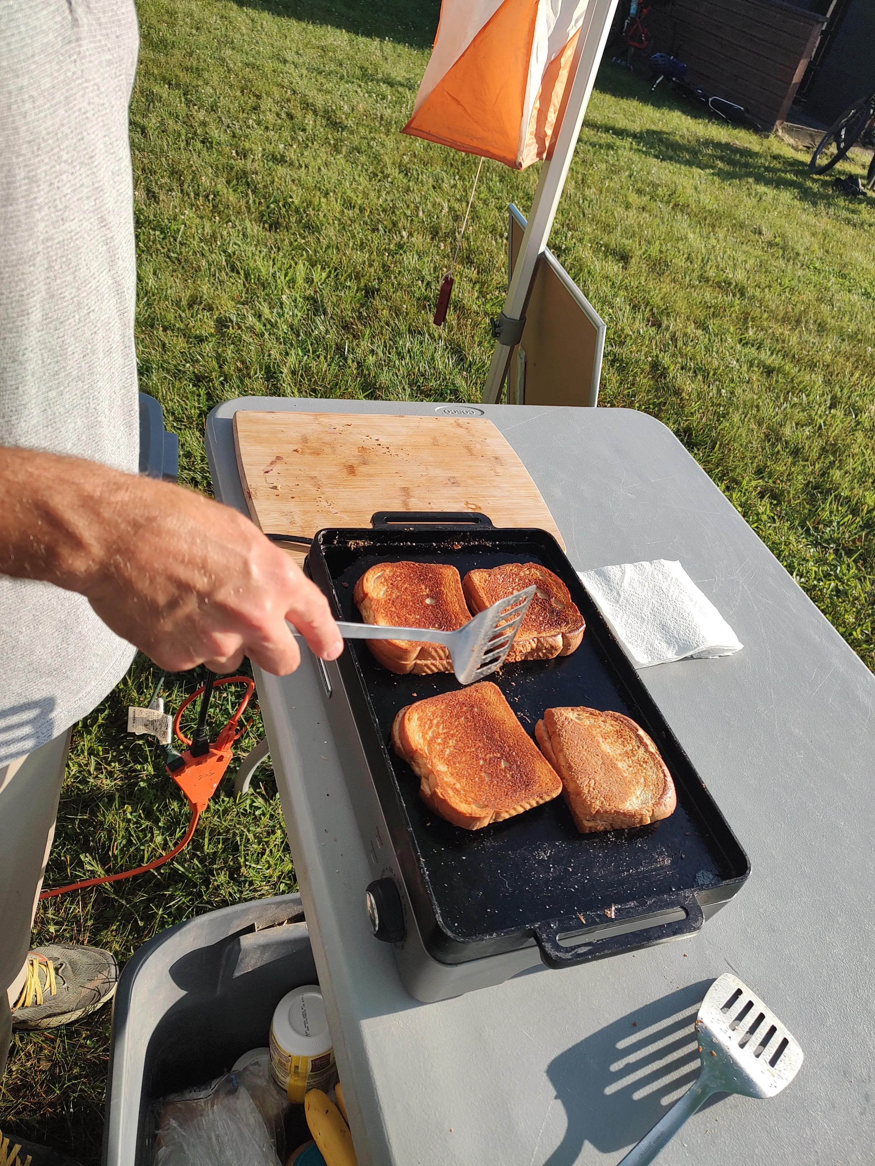 We made a strategic decision to sleep well at TA2, knowing the next day would be hot and we wanted to be on the river during peak temperatures. The grilled cheese sandwiches from the race volunteers were incredible fuel, and I slept under the stars while the others took the tent.